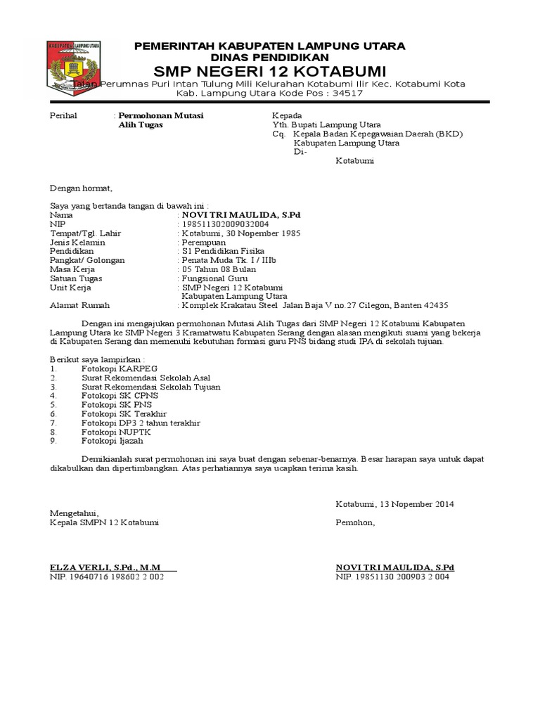Contoh sk pembagian tugas guru format terbaru 2016. Surat permohonan mutasi antar instansi.
